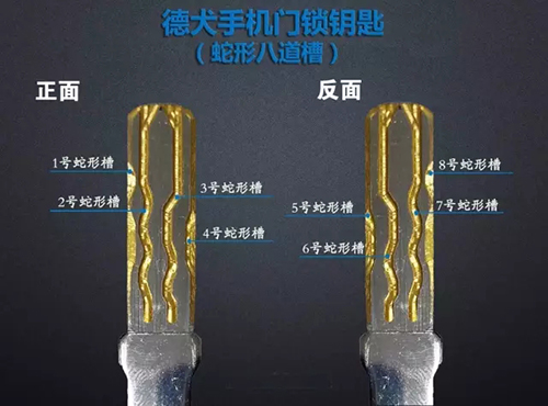 德犬手机门锁,采用的是C级锁芯,设计技术十分精巧,钥匙的正反两面拥有蛇形八道槽,是目前最复杂的钥匙纹路,制造精度达到新高度,我们称之为蛇形八道槽。