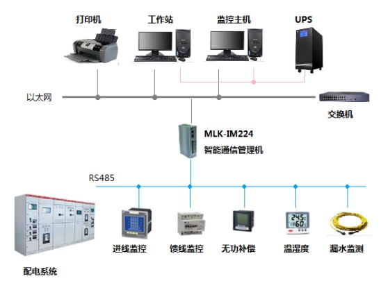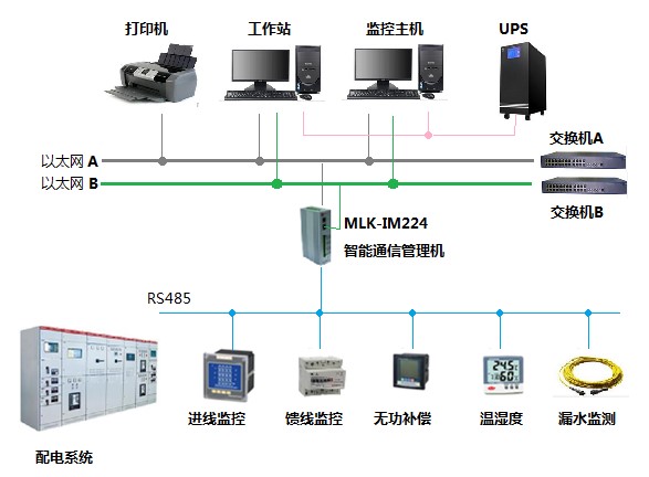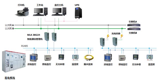 小型变配电站或低压等级的开关站和配电房中监控点较少,可靠性较高的情况下采用下图的网络结构,系统结构简单,性价比高。