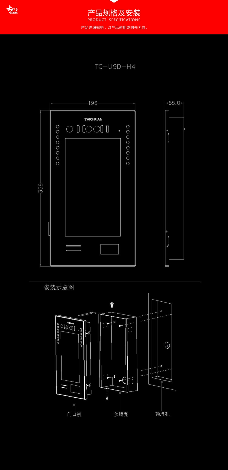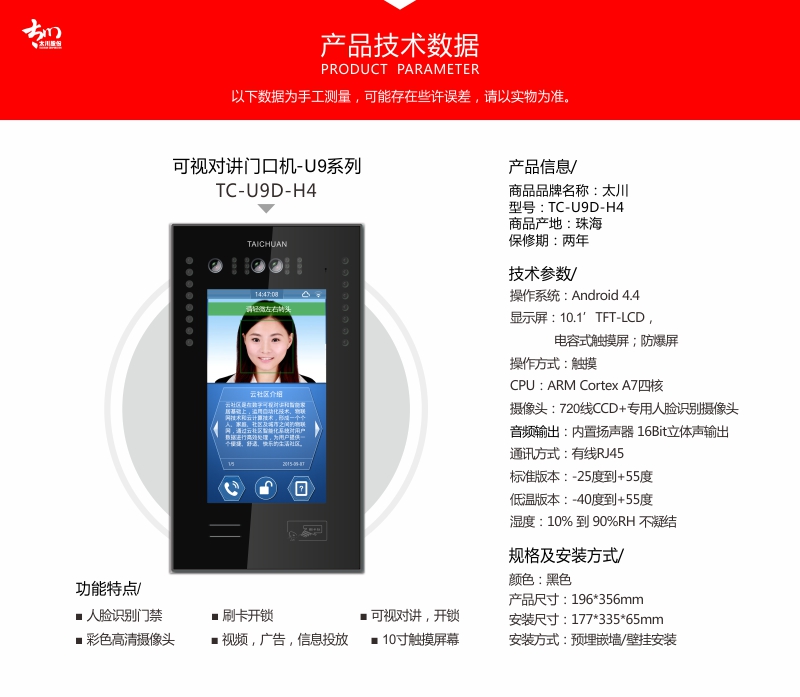 太川 TC-U9D-H4 可视对讲人脸识别门口机