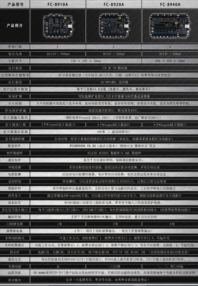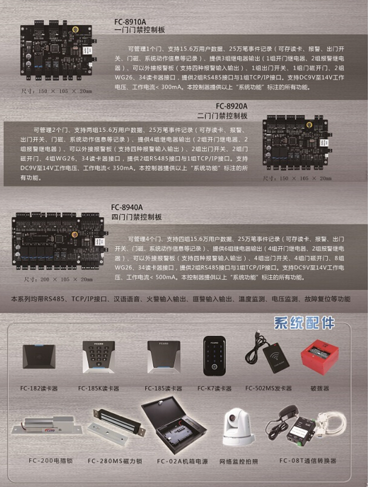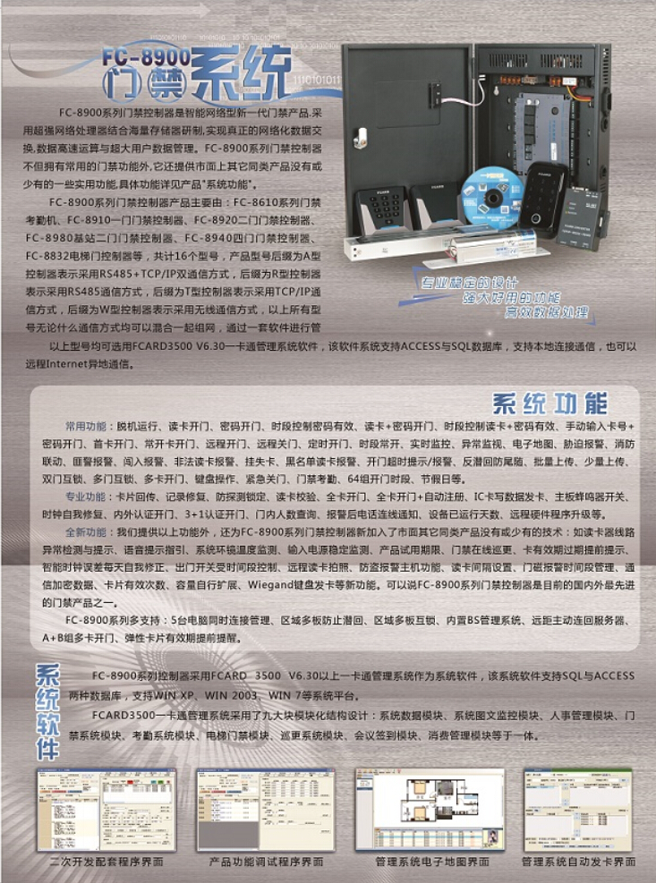 FC-8900系列门禁控制器产品主要由:FC-8610系列门禁考勤机、FC-8910一门门禁控制器、FC-8920二门门禁控制器、FC-8980基站二门门禁控制器、FC-8940四门门禁控制器、FC-8832电梯门控制器等,共计16个型号,产品型号后缀为A型控制器表示采用RS485+TCP/IP双通信方式,后缀为R型控制器表示采用RS485通信方式,后缀为T型控制器表示采用TCP/IP通信方式,后缀为W型控制器表示采用无线通信方式,以上所有型号无论什么通信方式均可以混合一起组网,通过一套软件管以上型号可选用FCARD3500 V6.30一卡通管理系统软件,该软件系统支持ACCESS与SQL数据库,支持本地连接通信,也可以远程Internet异地通信。
