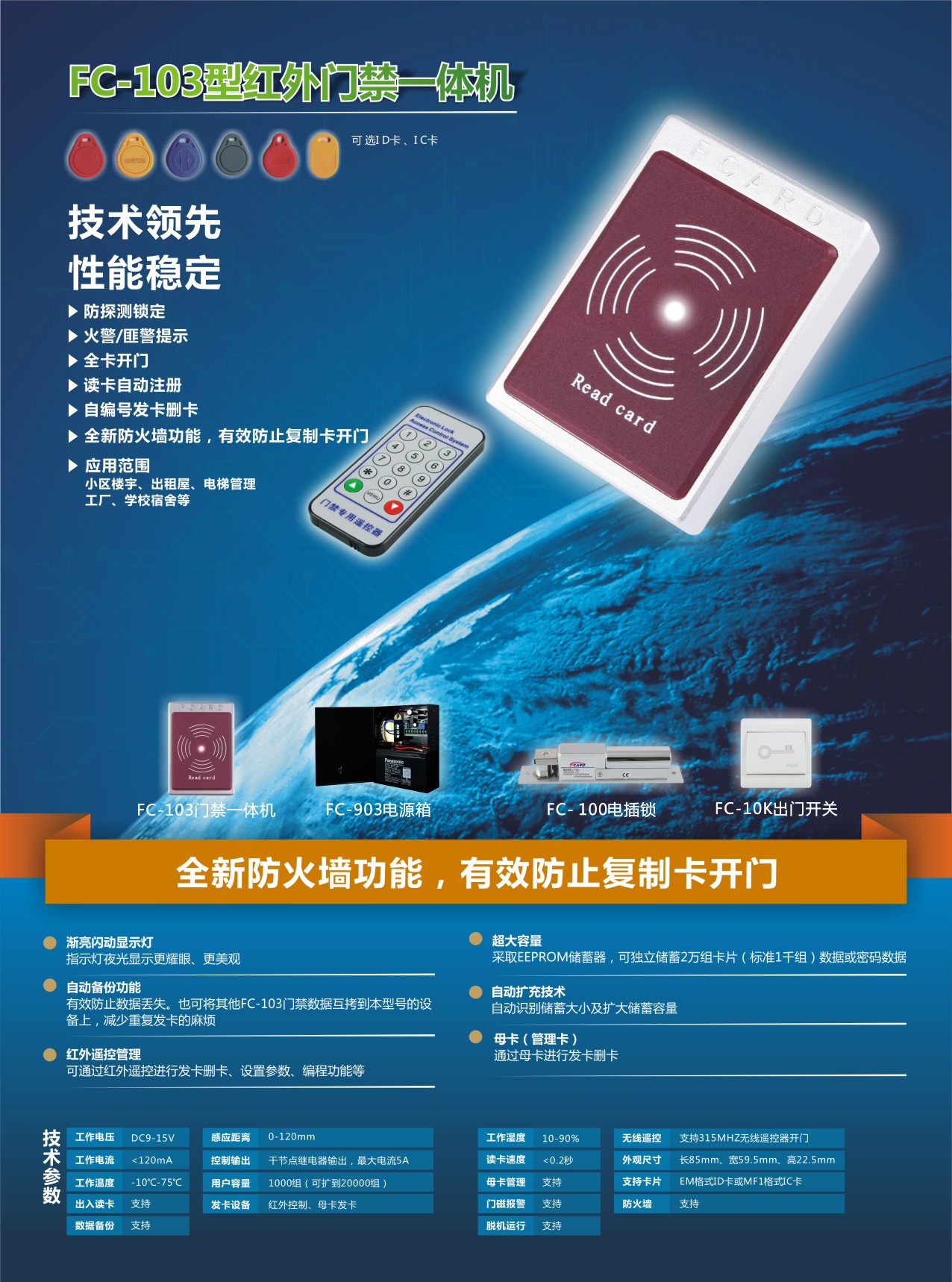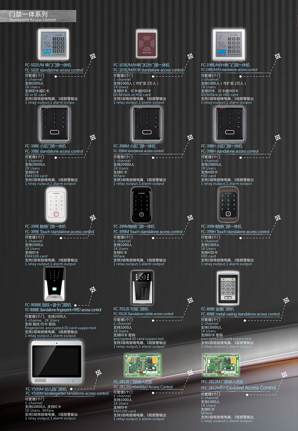 FC-098EMT8: 支持:ID卡、IC卡、遥控、8000用户、1组WG读卡接口(密码、卡、卡加密码开门)