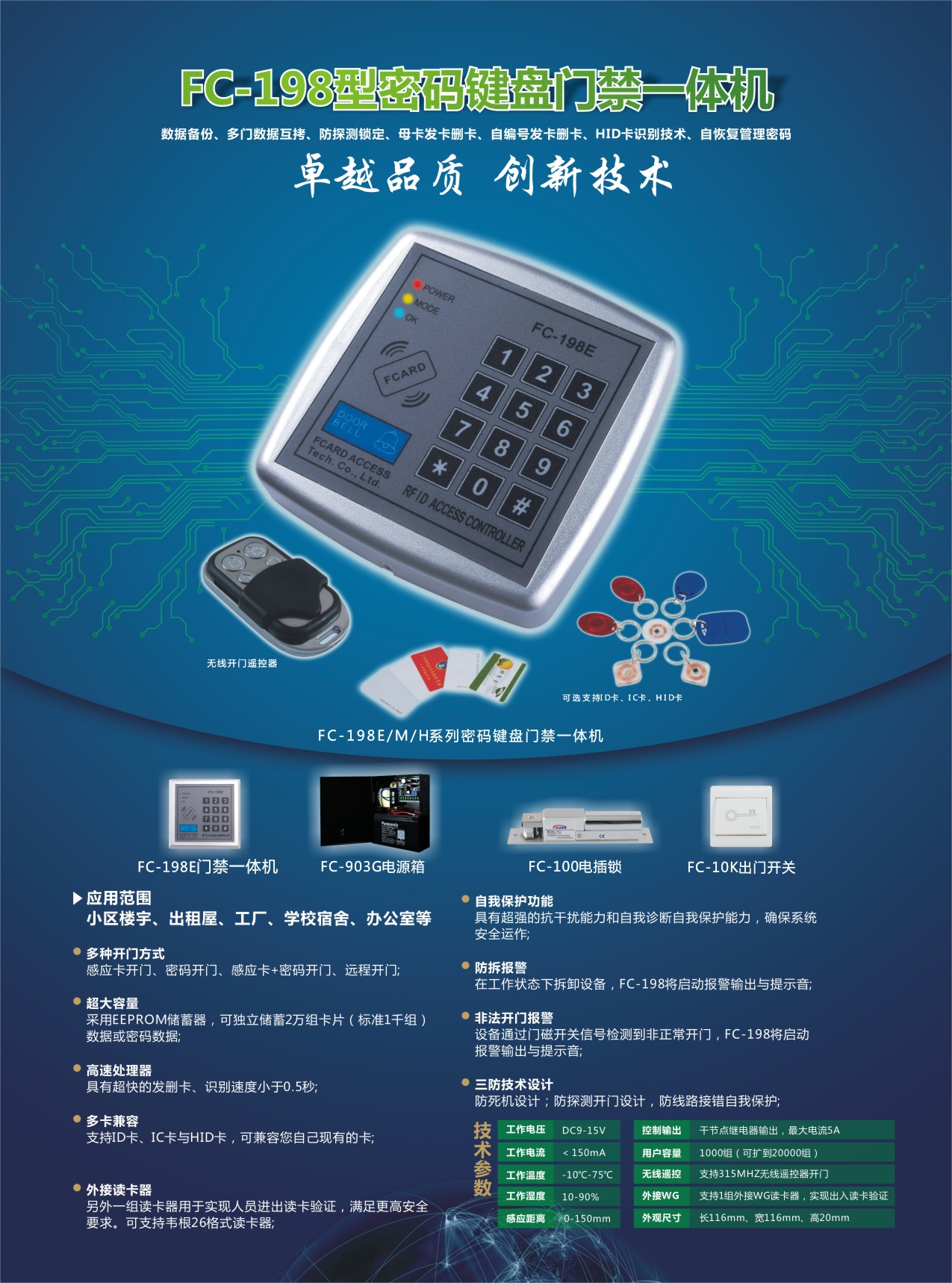 FC-098E: 支持:ID卡、1000用户、1组WG读卡接口、支持(密码、卡、卡加密码开门)