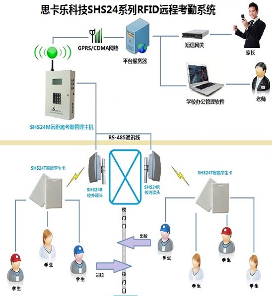 SHS24M远距离考勤管理主机负责对读头报上来的刷卡数据进行判断和管理,并将有效的考勤记录通过GSM/CDMA网络上报给服务器平台。带LCD显示、键盘操作、后备电池,支持多路读头,6KV的防雷等级设计,支持全国各省市的校讯通/家校通/翼校通平台。 SHS24R高频读头,2.4G读卡设备,负责远距离自动设别和读取学生佩带或携带的学生智能卡,并将数据传给主机进行处理,实现无障碍远距离自动考勤。采用增益可调的定向天线设计,高速485接口,6000KV的最高等级防雷设计,400张/秒的识别速度。 三合一2.4G智能学生卡,是学生进出校门的RFID电子学生证,由学生随身佩带,具备有2.4G和13.56M双频的RFIDIC电子标签功能的复合卡,带有SIM卡插槽,用来拨打无线电话。符合全国各省的校讯通/家校通/翼校通平台的标准要求,不漏读,不误读,功耗低,防水耐用,高防冲突,具有一卡通功能。SHS24M远距离考勤管理主机