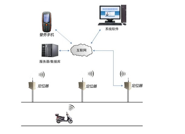 本系统利用安装在电动自行车上的有源 RFID 电子标签,以及部署在街道公共区域的RFID定位基准,借助智慧城市基础网络、 视频监控体系、 智慧城市地理空间系统,实现对车辆的自动感知、 自动识别、智能定位和进程监控,形成人与物、物与物相联,实现信息化、进程管理控制和智能化的管理网络。