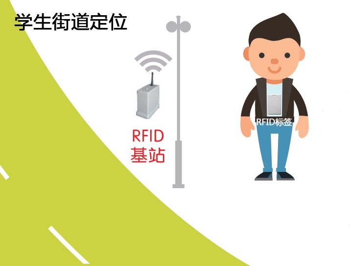 学生走出校园,佩戴的SRD24T1 RFID电子标签被街道上安装的RFID基站识别,RFID基站把学生的行动轨迹发送到家长的手机,家长通过手机APP实时查看学生的位置信息,确保学生的出校安全。