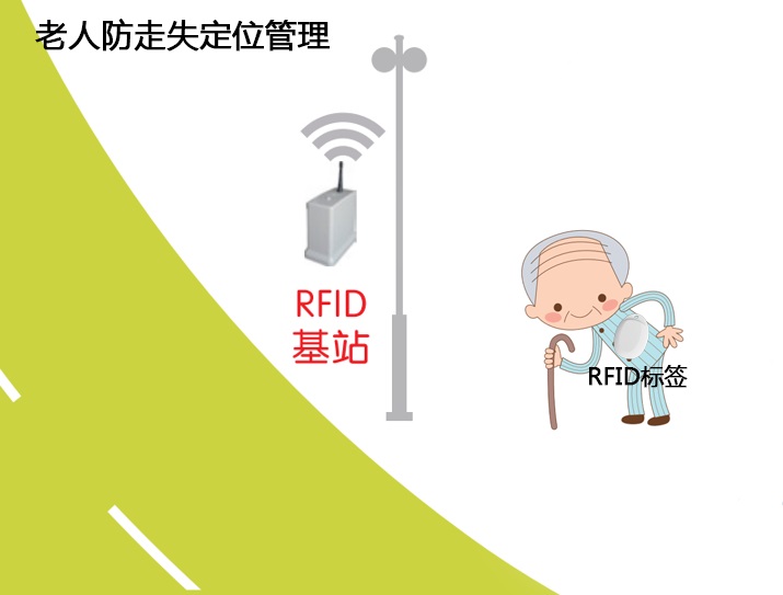老年人佩戴SRD24T2 RFID电子标签,当养老院RFID基站定位器未识别到老人的RFID电子标签信息时,说明老人已走失,离开养老院,此时可通过街道上的RFID基站定位到老人所在位置,成功找到走失的老人。