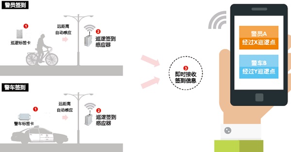 警员佩戴SRD24T1 RFID电子标签,警车安装SRD43P9 RFID电子标签,当警员或警车经过安装RFID基站定位器的街道时,巡逻信息会被RFID基站定位器自动识别,并发送到云平台,管理者可以通过后台软件,或手机APP实时查看巡逻动态。