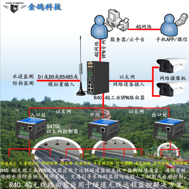 R40 4G 工业 VPN 无线路由器应用于远程隧道监控系统中监测环境质量、通风系统、给排水消防系统、照明系统、交通引导系统的监控与远程人工控制或自动控制。