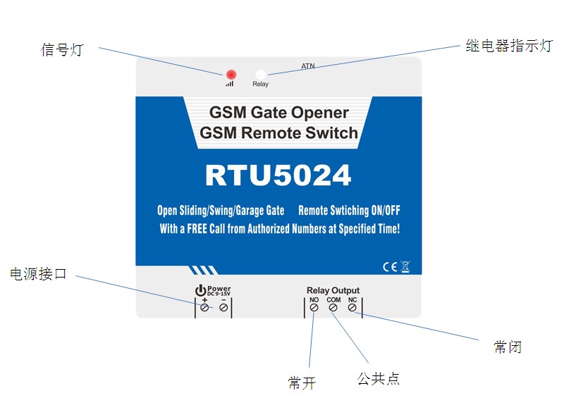 2.一路继电器输出,有权限的号码呼入后则自动闭合,在达到设定的时间后则自动断开。
