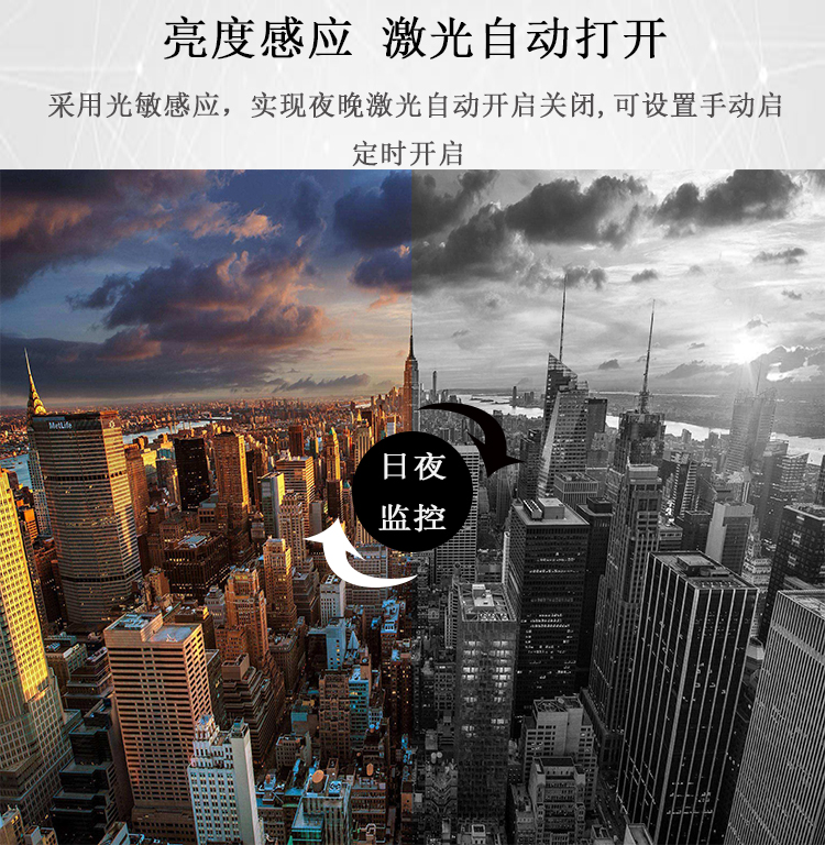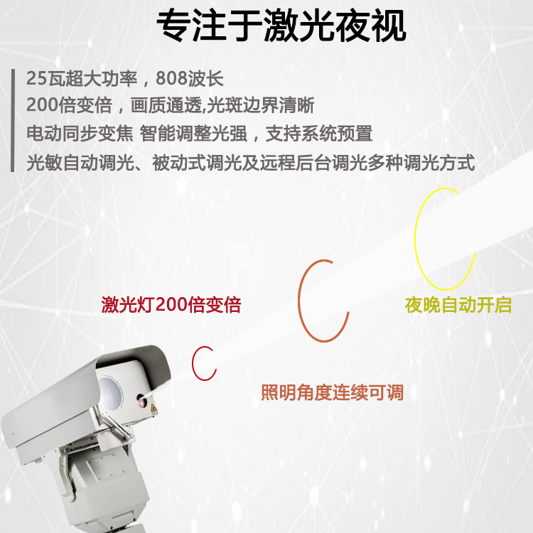 控制方式 | 光敏传感器智能控制,可读取环境照度并自动开启/关闭激光器,强光延时判断3档可调,支持远程手动强制开启/关闭激光器,智能随动控制,激光出射角度连续变化,夜间光斑同步镜头变倍 | |||