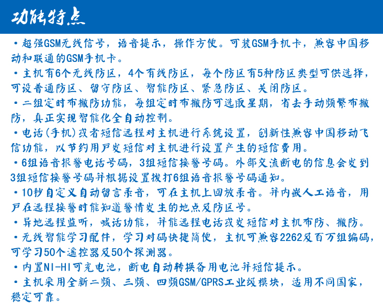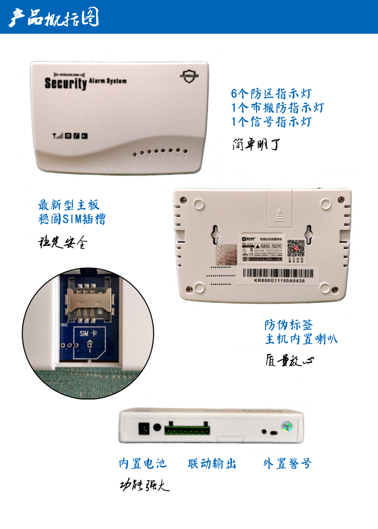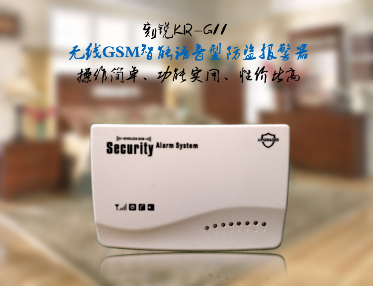 KR-G11无线GSM报警器,6个无线防区4个有线防区,6组报警电话3组报警短信,频率为315MHZ,可学习50个配件和50个遥控器。