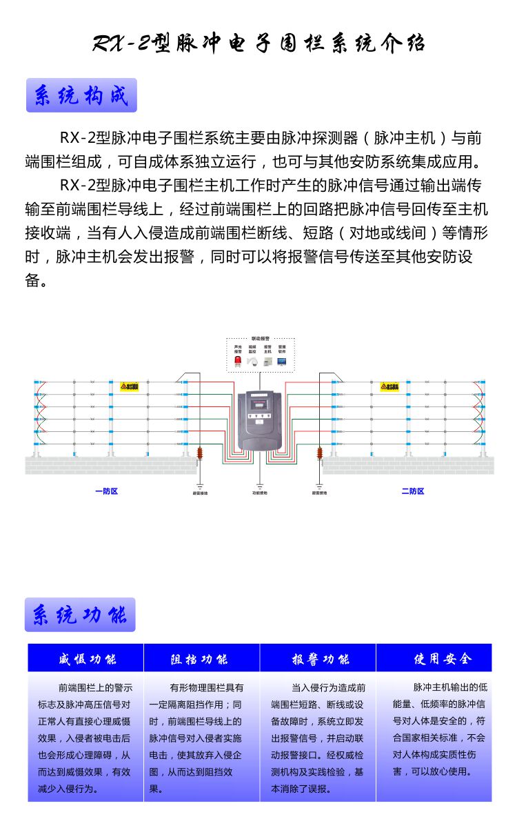 二、应用范围:集威慑、阻挡、报警、联动多重功能于一体,主要应用于电力变电站、住宅小区、别墅、厂矿企业、轨道交通、水厂、电厂、机场、学校、监狱、看守所、物资仓库、部队等场所周界安全防范。