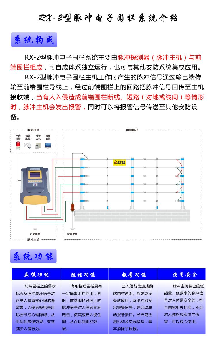 二、应用范围:集威慑、阻挡、报警、联动多重功能于一体,主要应用于电力变电站、住宅小区、别墅、厂矿企业、轨道交通、水厂、电厂、机场、学校、监狱、看守所、物资仓库、部队等场所周界安全防范。