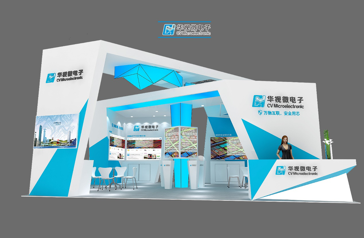 此次华视微电子展位设计风格以充满富有科技感的蓝白logo为主色调,展台造型为开放式的X型布局,嵌入华视微电子的展会主题,参观者可以从多种角度多个入口进行参观。华视微电子在3号馆C91,静候您的参观指导!