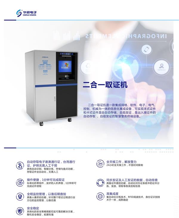 出入境证件取证机,是一款集成网络、软件、电子、电气、控制、机械为一体的自助办理终端设备,设备通过读取证件芯片信息,实现电子护照、港澳通行证、电子赴台证的集中自动存储及自助取证,设备支持本式、卡式、卡本合一三种规格的证件发放。