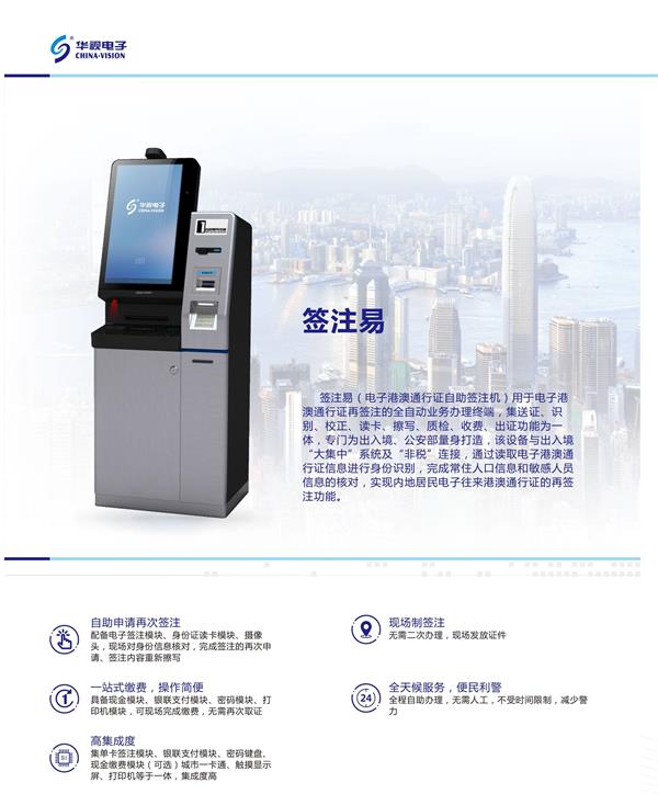 签注易(电子港澳通行证自助签注机)用于电子港澳通行证再签注的全自动业务办理终端,集送证、识别、校正、读卡、擦写、质检、收费、出证功能为一体,专门为出入境、公安部量身打造,该设备与出入境“大集中”系统及“非税”连接,通过读取电子港澳通行证信息进行身份识别,完成常住人口信息和敏感人员信息的核对,实现内地居民电子往来港澳通行证的再签注功能。