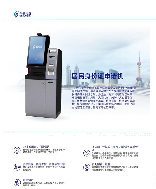 居民身份证申请机是一款申请个人身份证件及验证信息的自助终端,通过申请人输入个人身份信息或读取居民身份证(旧证)确认身份后,就可以完成指纹采集、申请表格填写、打印、人像比对,关联个人的证照信息。该终端可有效实现填表、信息采集、信息提交等功能,极大的缩短了人工申请所需的等待时间,降低了前台民警的工作量,提高了办证的效率。