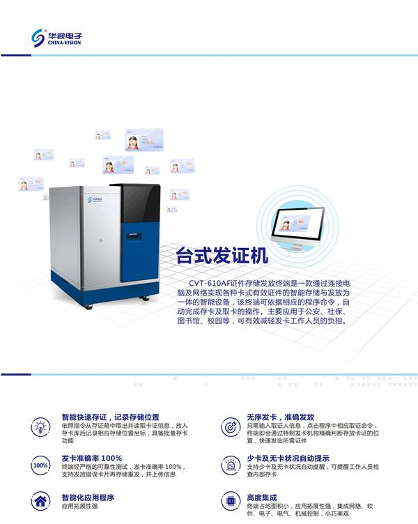 CVT-610AF身份证发证终端是一款通过连接电脑及网络实现身份证件的智能存储与发放为一体的智能设备,该终端可依据相应的程序命令,自动完成存卡及取卡的操作。主要应用于公安户政业务,可有效减轻户籍民警工作负担。