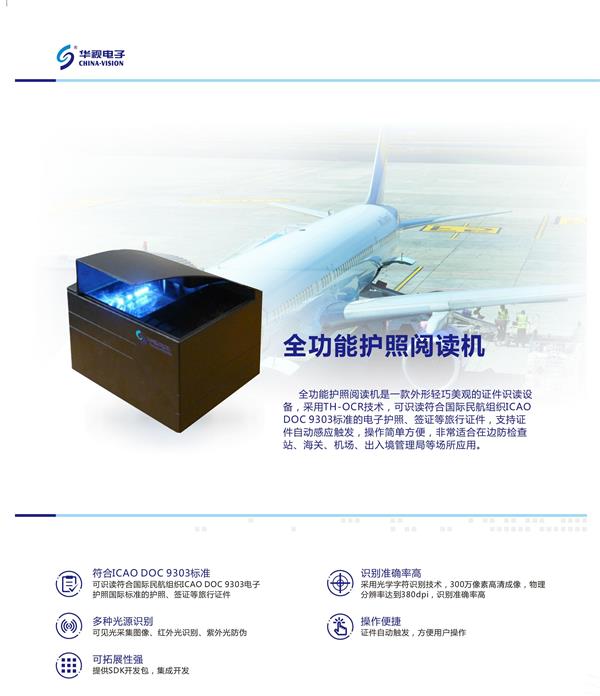 全功能护照阅读机是一款外形轻巧美观的证件识读设备,采用TH-OCR技术,可识读符合国际民航组织ICAO DOC 9303标准的电子护照、签证等旅行证件,支持证件自动感应触发,操作简单方便,非常适合在边防检查站、海关、机场、出入境管理局等场所应用。