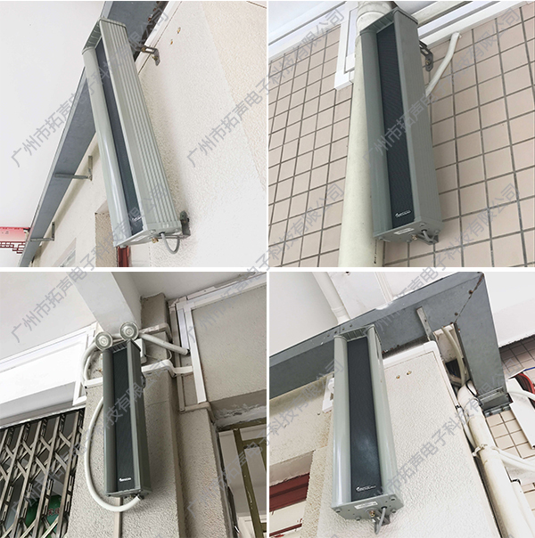 大型室外全天候音柱是铝合金材质,采用壁挂式安装方式,由3个6寸的喇叭组成。