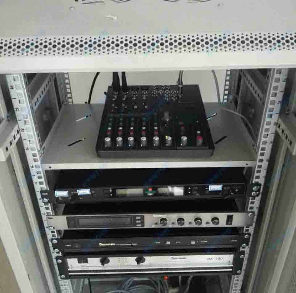 50平方的会议室,相对于20平方的会议室,根据场所要求使用低音单元: 8"×1,高音单元: 1"×1的RAY108A音箱,更大功率的PA450功放,12路调音台MC12CX,这套系统的扩散范围宽广,声场地位准确,高度还原人声,话筒的声音洪亮清晰。