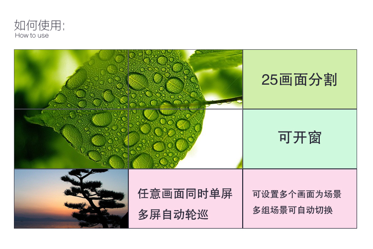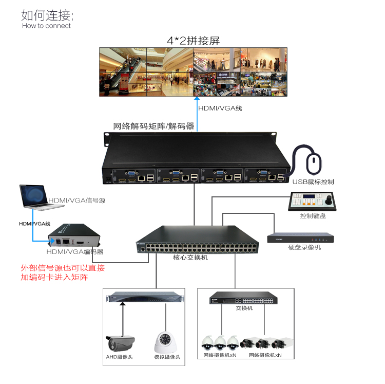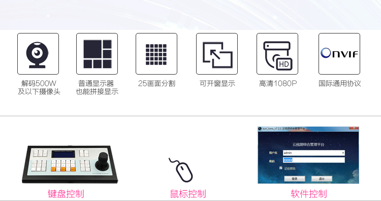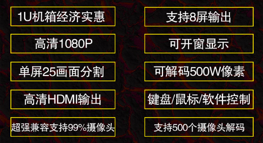 1U小型网络解码矩阵拥有HDMI接口或VGA接口同时解码输出,可适应不同的显示设备。它支持国内外众多不同厂家的ONVIF协议及各种网络传输协议、多码流解码方式,为大中小型拼接电视墙解码切换服务提供强有力的支持。它支持1080P/720P高清网络球机的控制,控制时间少于1秒,控制流畅、灵活。它支持报警联动自动切屏功能,它能自动搜索系统中IP摄像机并支持ip地址冲突检测。