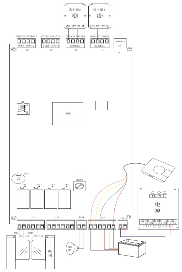 接入波特率为19200的身份阅读器一路,通讯正常时,主板LED指示灯RX1、TX1会高频闪亮,读取身份信息后,主板LED RX1会闪亮一次;