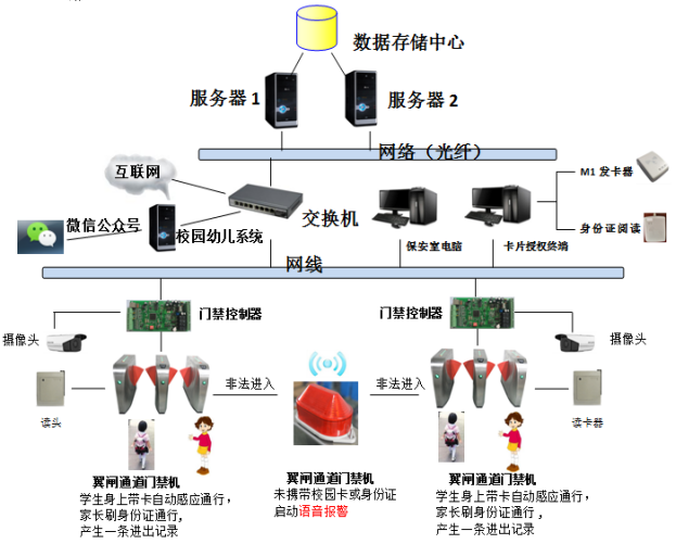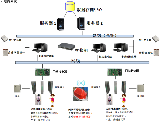 1、校方登记学生信息,发放校园卡,在无障碍通道中建立卡片和人员的对应关系;