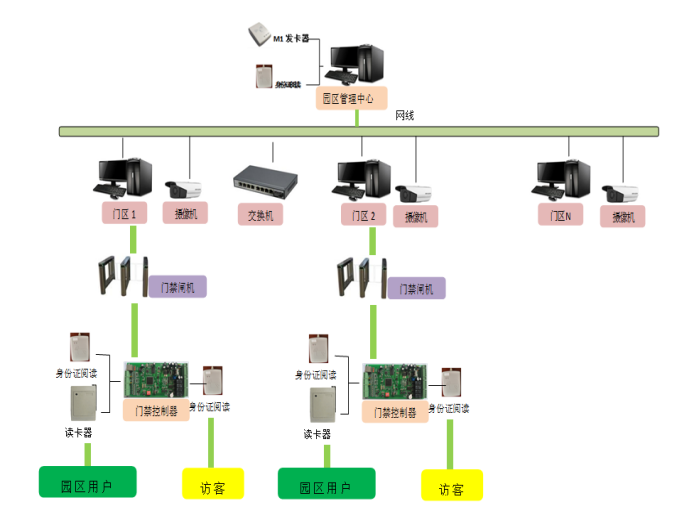 1、工业园固定用户刷IC卡或者是身份证开门;
