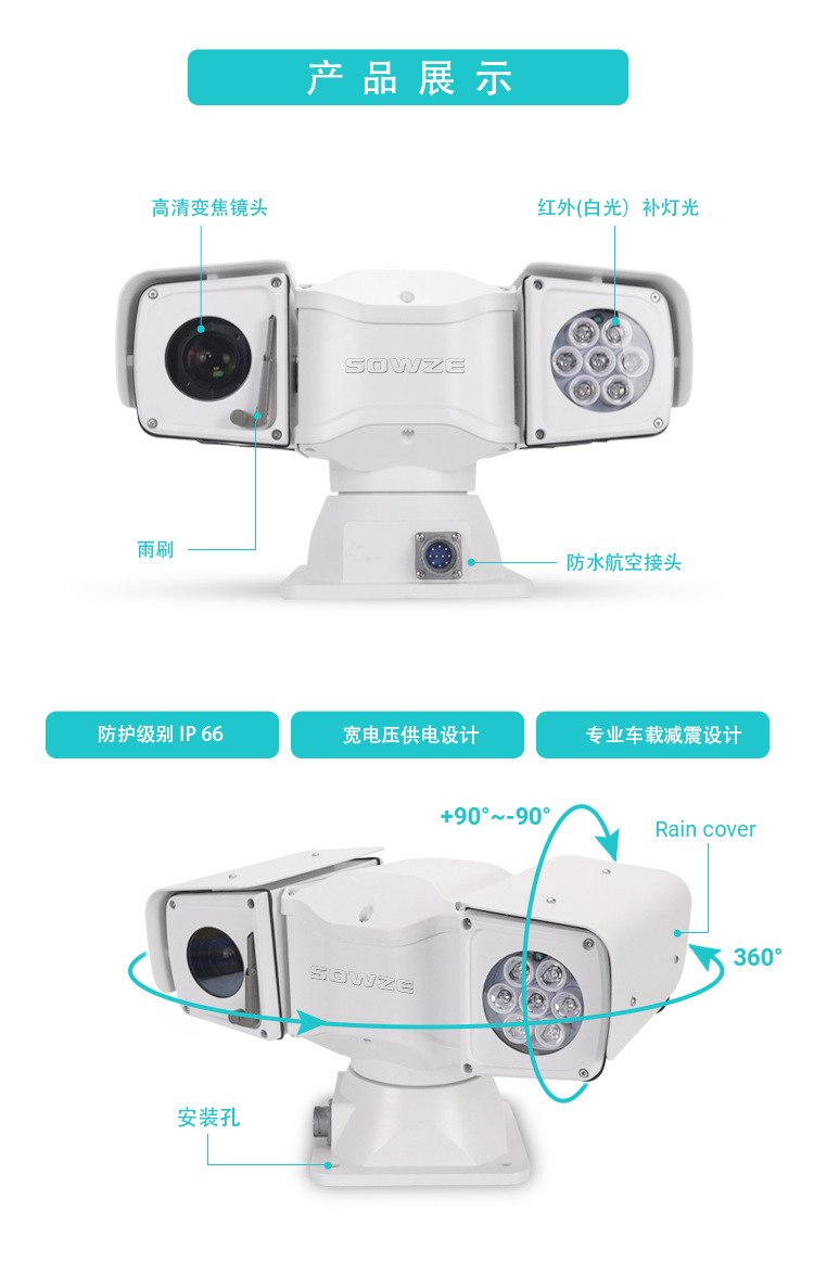 云台采用正装安装方式,配合减震器定点安装,可实现全天候车载监控。