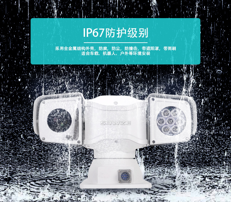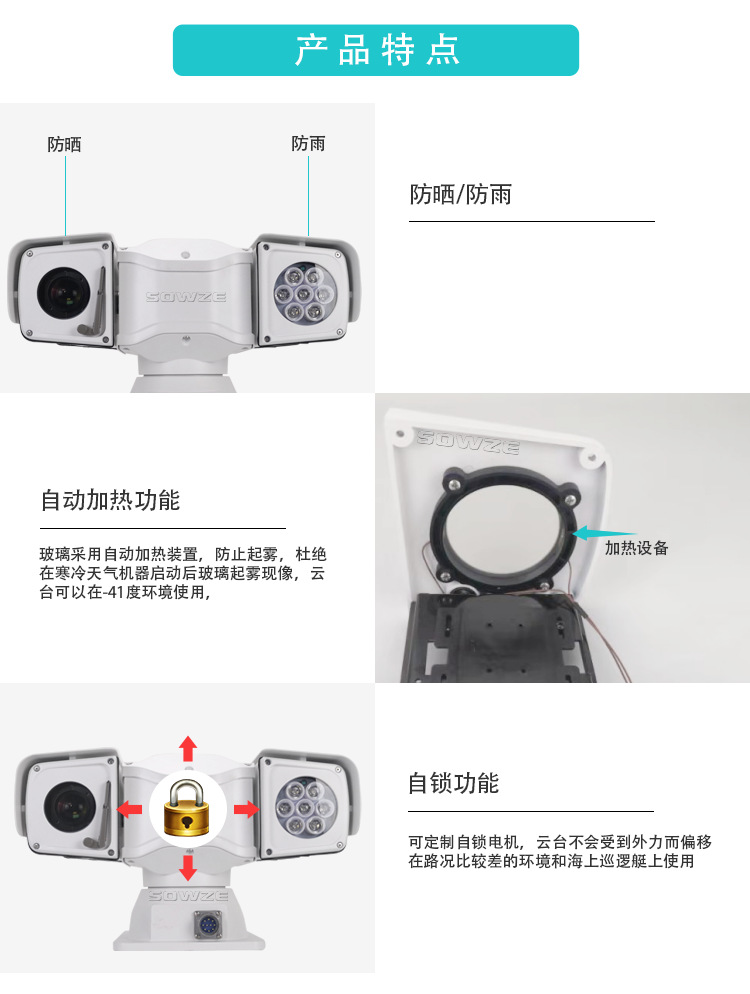 云台采用全天候环境设计,带遮阳罩,带雨刷;