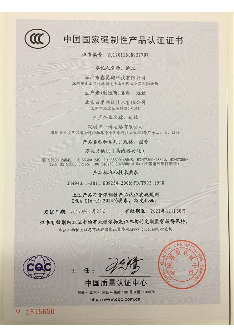2017年1月,昊翔® 交换机通过中国国家强制性产品认证证书(3C认证)