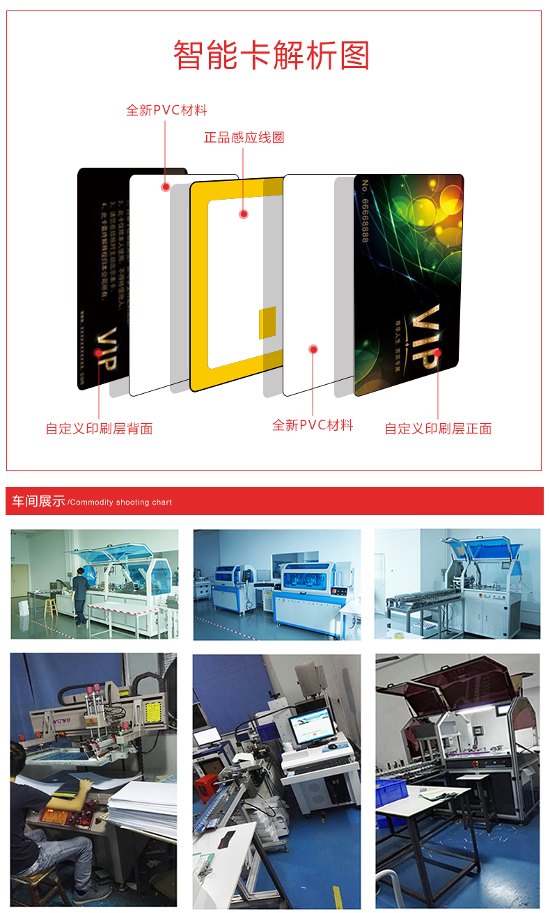 - 本公司主要制作PVC卡和智能卡,卡片的种类有:接触式IC卡、非接触式IC卡、ID卡、人像卡、贵宾卡、会员卡、磁条卡、条码卡、射频卡、学生证、校园卡、异形卡、刮刮卡、医疗卡、金卡、银卡、铂金卡、酒店预订卡、感应IC卡、感应ID卡、透明卡、磨砂卡、半透明磨砂卡、钻石卡、水晶卡等各类PVC塑胶卡片、工作卡、刮刮卡、积分卡、考勤卡等。本司采用四色印刷,具有印刷精度高、色彩鲜艳、出货快的特点,同时改进了传统的制卡工艺,有效地避免了偏色、卡面刮花等等制卡常见质量问题。质量过硬、价格适中是本司的最大优势。