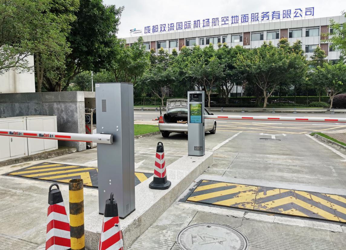 国航西南分公司停车场共设4进5出,全部采用银色的蓝卡LCD高速车牌识别道闸扫码付一体机。