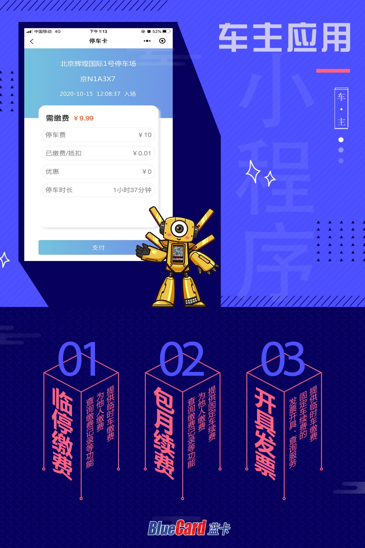 车主可以利用蓝卡车主小程序完成临停缴费、包月续费、开具发票等功能操作。