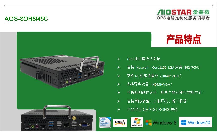 深圳市爱鑫微电子有限公司为更好的配合不同厂家的要求,可提供OPS主板与OPS准系统的方案配合各个广告机,触控一体机厂家,多媒体壁挂式教学一体机,数字标牌,录播触控一体机,同时保证所提供OPS主板与OPS插拔式电脑/OPS-C插拔式电脑主机是完全按照INTEL OPS规范定义的,完全支持鸿合教育一体机、东方中原教育一体机、创维教育一体机、康佳教育一体机、中银液晶触控一体机、中电数码教育一体机、海尔触控一体、TCL触控一体机、KTC/HKC/HPC等各大交互式教育触控一体机厂家,爱鑫微电子提供专业的定制化服务OEM/ODM.现阶段我司已推出了一系列OPS电脑方案如下: