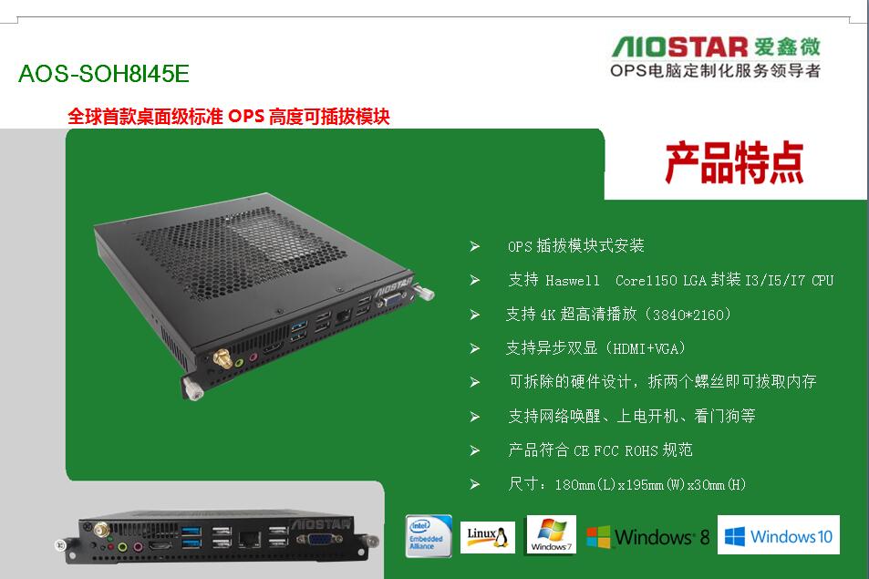 深圳市爱鑫微电子有限公司为更好的配合不同厂家的要求,可提供OPS主板与OPS准系统的方案配合各个广告机,触控一体机厂家,多媒体壁挂式教学一体机,数字标牌,录播触控一体机,同时保证所提供OPS主板与OPS插拔式电脑/OPS-C插拔式电脑主机是完全按照INTEL OPS规范定义的,完全支持鸿合教育一体机、东方中原教育一体机、创维教育一体机、康佳教育一体机、中银液晶触控一体机、中电数码教育一体机、海尔触控一体、TCL触控一体机、KTC/HKC/HPC等各大交互式教育触控一体机厂家,爱鑫微电子提供专业的定制化服务OEM/ODM.现阶段我司已推出了一系列OPS电脑方案如下: