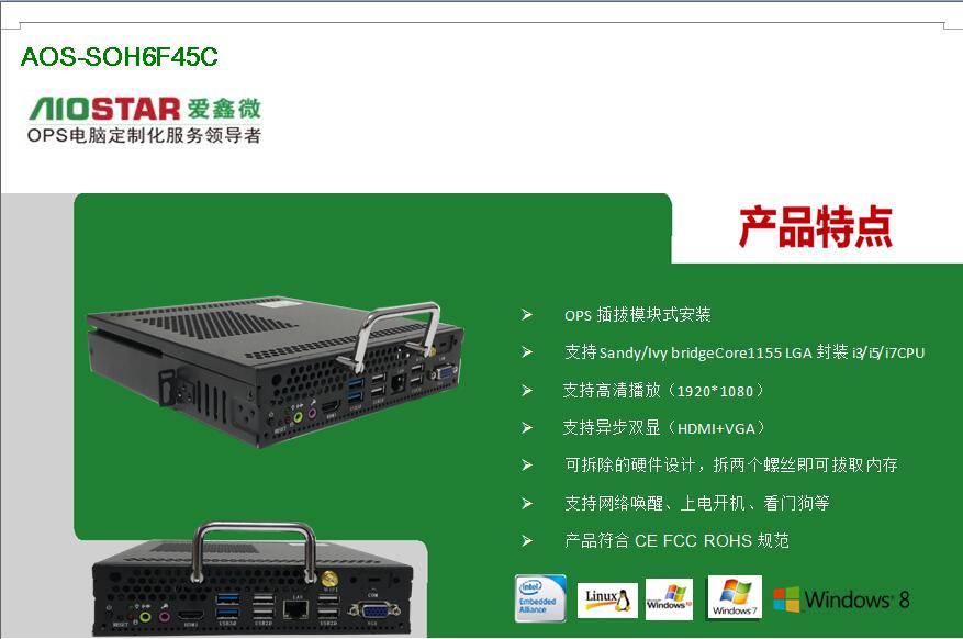 深圳市爱鑫微电子有限公司为更好的配合不同厂家的要求,可提供OPS主板与OPS准系统的方案配合各个广告机,触控一体机厂家,多媒体壁挂式教学一体机,数字标牌,录播触控一体机,同时保证所提供OPS主板与OPS插拔式电脑/OPS-C插拔式电脑主机是完全按照INTEL OPS规范定义的,完全支持鸿合教育一体机、东方中原教育一体机、创维教育一体机、康佳教育一体机、中银液晶触控一体机、中电数码教育一体机、海尔触控一体、TCL触控一体机、KTC/HKC/HPC等各大交互式教育触控一体机厂家,爱鑫微电子提供专业的定制化服务OEM/ODM.现阶段我司已推出了一系列OPS电脑方案如下: