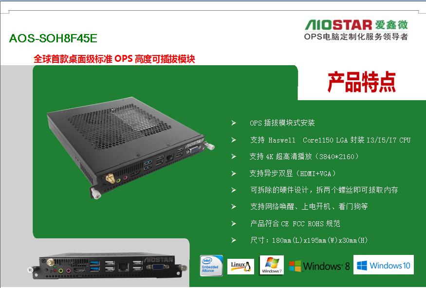 深圳市爱鑫微电子有限公司为更好的配合不同厂家的要求,可提供OPS主板与OPS准系统的方案配合各个广告机,触控一体机厂家,多媒体壁挂式教学一体机,数字标牌,录播触控一体机,同时保证所提供OPS主板与OPS插拔式电脑/OPS-C插拔式电脑主机是完全按照INTEL OPS规范定义的,完全支持鸿合教育一体机、东方中原教育一体机、创维教育一体机、康佳教育一体机、中银液晶触控一体机、中电数码教育一体机、海尔触控一体、TCL触控一体机、KTC/HKC/HPC等各大交互式教育触控一体机厂家,爱鑫微电子提供专业的定制化服务OEM/ODM.现阶段我司已推出了一系列OPS电脑方案如下: