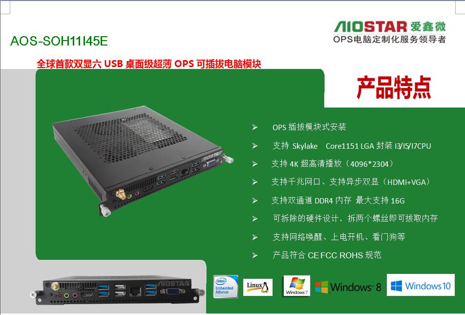 深圳市爱鑫微电子有限公司为更好的配合不同厂家的要求,可提供OPS主板与OPS准系统的方案配合各个广告机,触控一体机厂家,多媒体壁挂式教学一体机,数字标牌,录播触控一体机,同时保证所提供OPS主板与OPS插拔式电脑/OPS-C插拔式电脑主机是完全按照INTEL OPS规范定义的,完全支持鸿合教育一体机、东方中原教育一体机、创维教育一体机、康佳教育一体机、中银液晶触控一体机、中电数码教育一体机、海尔触控一体、TCL触控一体机、KTC/HKC/HPC等各大交互式教育触控一体机厂家,爱鑫微电子提供专业的定制化服务OEM/ODM.现阶段我司已推出了一系列OPS电脑方案如下: