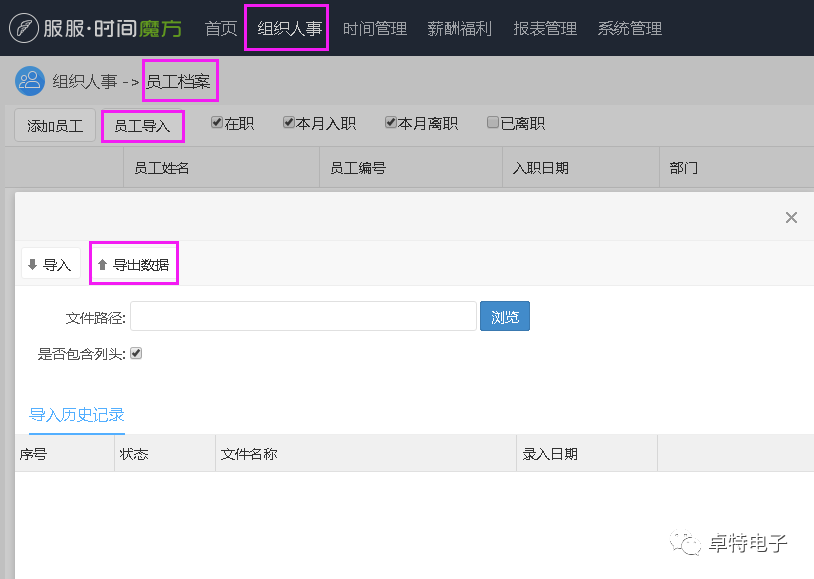 1、点击组织人事->员工档案->员工导入,在弹出的操作窗口中选择“导出数据”,下载员工档案模板
