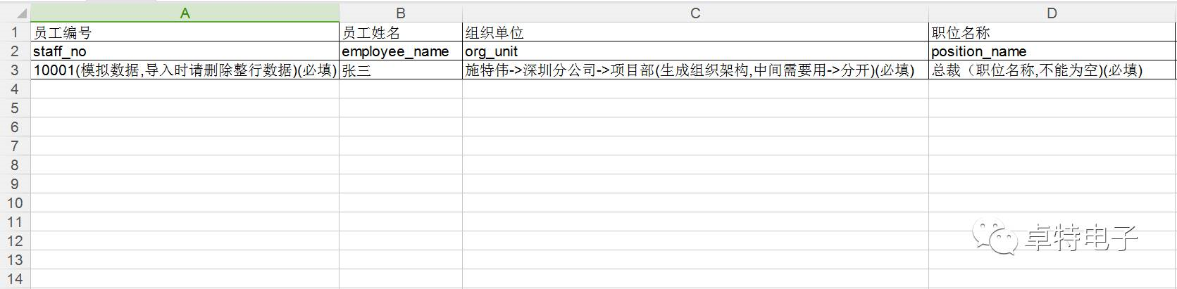 2、打开下载的员工档案模板,严格按照规定填写,特别是必填项目;完成后删除示例数据(即Excel第3行),点击保存