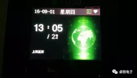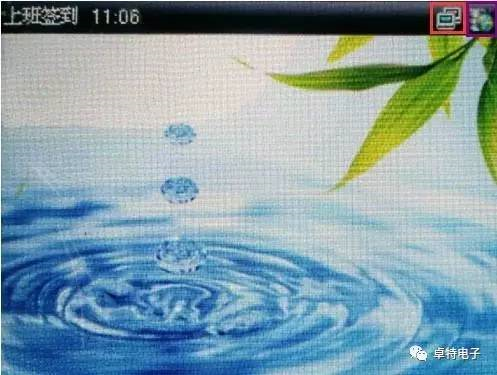 1、服服考勤连接电源和网线(区分有线网和无线网),界面右上角如下图所示则表示考勤机正常联网,并且连接上服服云平台