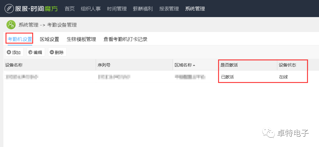 2、登录服服web端,点击系统管理->考勤设备管理,考勤机状态显示已激活、设备状态显示在线(如下图所示),则考勤机正常联网,也连接上服服云平台