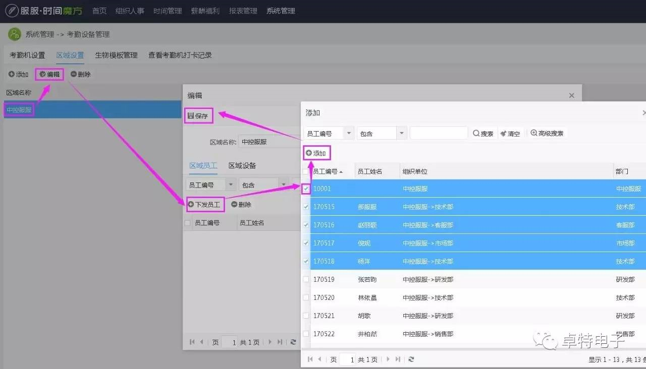 系统管理->考勤设备管理->区域设置,选中区域名称,点击“编辑”在弹出的操作窗口中选中“下发人员”按钮,勾选人员之后点击“添加”,再选中区域设备->添加现有设备,勾选设备名称后“添加”点击“保存”