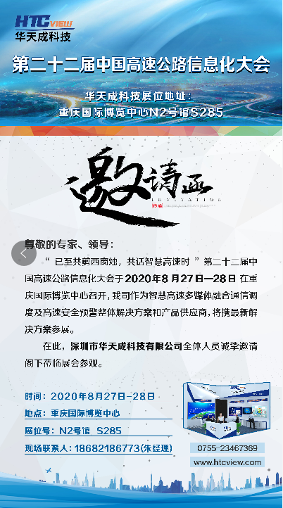 “已至共剪西窗烛,共话智慧高速时”第二十二届中国高速公路信息化大会于2020年8月27日- -28日在重庆国际博览中心召开,我司作为智慧高速多媒体融合通信调度及高速安全预警整体解决方案和产品供应商,将携最新解决方案参展。