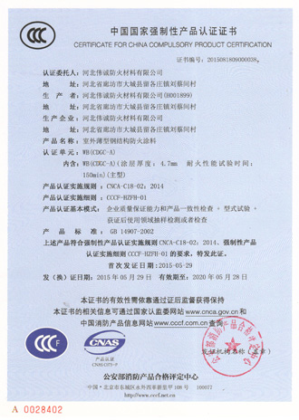 经搅拌后防火涂料呈均匀稠厚流体状态,无结块。 | 12h | 允许出现1-3条裂纹,其宽度应不大于0.5毫米 | ≥0.15 | ≥0.05 | ≥15涂层应无开裂、脱落、起泡现象 | 70.93h |