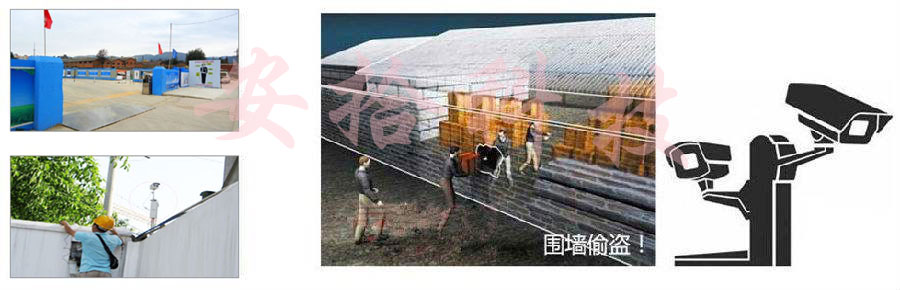 鉴于建筑工地人员的复杂性,综合工地现场环境等安全因素,安装围墙3G无线网络高清视频监控,对工地围墙各重要区域进行24小时全天候监控。围墙监控系统针对工地外围、外围大门、外围通道、外围安全出入口等区域,负责采集出入人员、来往车辆、物资运送情况的高清视频图像信息。如图