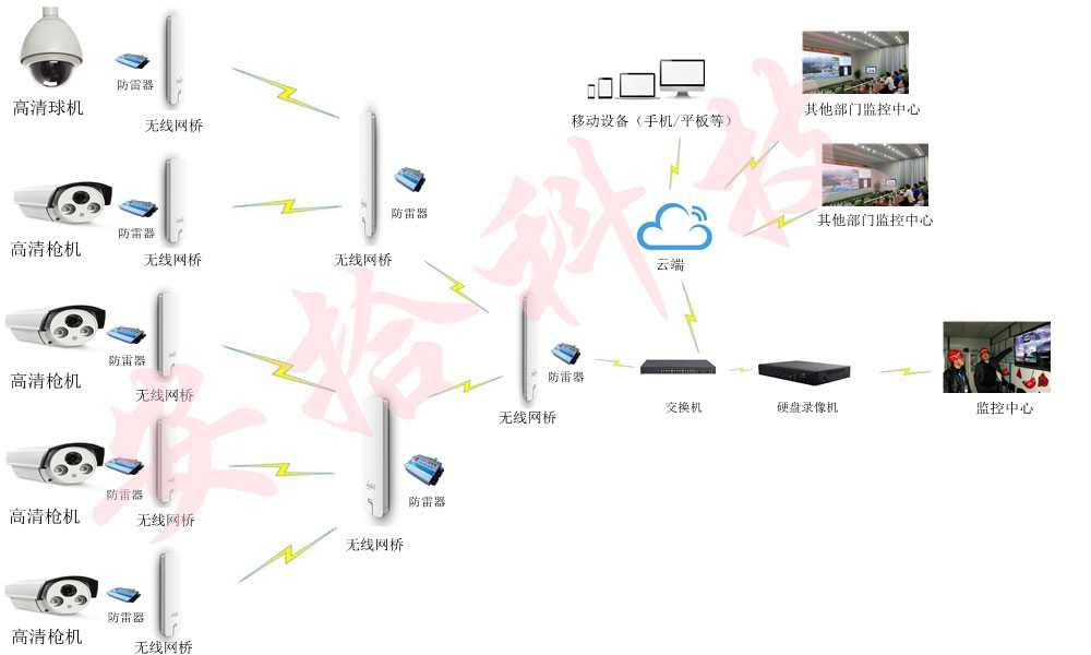 建筑工地工人宿舍人员集中复杂,也是偷盗事件等各种纠纷的高发区。工人宿舍安装无线高清视频监控系统,对宿舍重要区域进行监控,加强对工人的安保措施。宿舍无线监控系统主要负责工人宿舍外围、宿舍大门、宿舍通道等公共区域,采集出入人员、出入车辆、物资运送的高清视频图像信息。如图