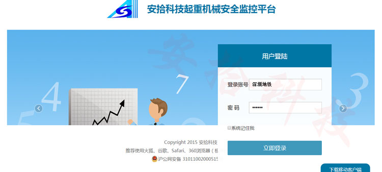 < 3 > AS-104型塔机安全管理信息系统能够针对已安装AS-101塔机安全监测仪的塔机,可通过远程信息监管平台中心 ,实现远程监管,及时掌握公司所有项目塔机的运行实时状态。如图2.1塔机安全监控管理平台登录